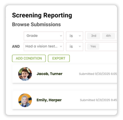 Create customizable prescreening forms to collect physical assessments like vision, hearing, and blood pressure. Easily filter, generate reports, and export or print entries with student details, dates, and timestamps for streamlined compliance.